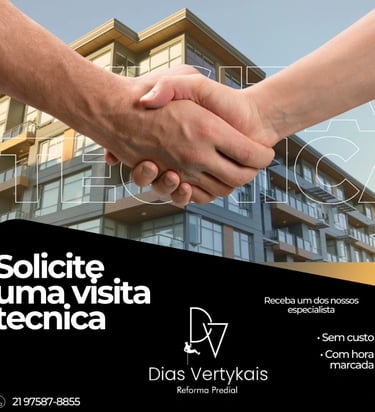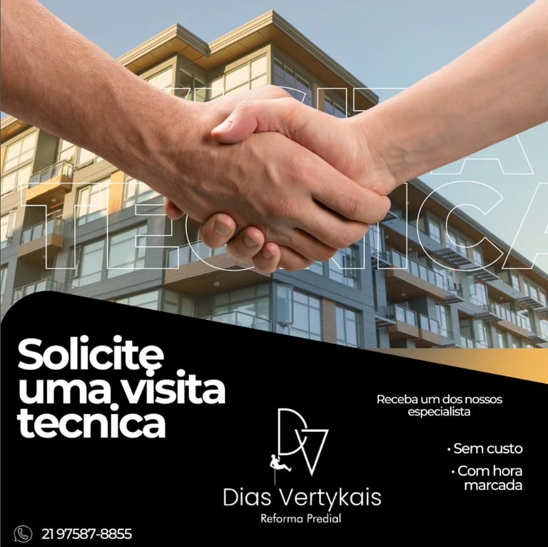 A visita técnica é a oportunidade de você esclarecer todas as suas dúvidas, questionar as patologias da sua obra, conhecer a empresa através do atendimento, do conhecimento técnico, da experiência operacional de quem poderá futuramente conduzir e executar os seus serviços. Saiba que tudo isso é feito com muita empatia, presteza e eficiência de forma organizada (agendamento prévio) e sem custo ou nenhum tipo de compromisso entre condomínio/empresa.